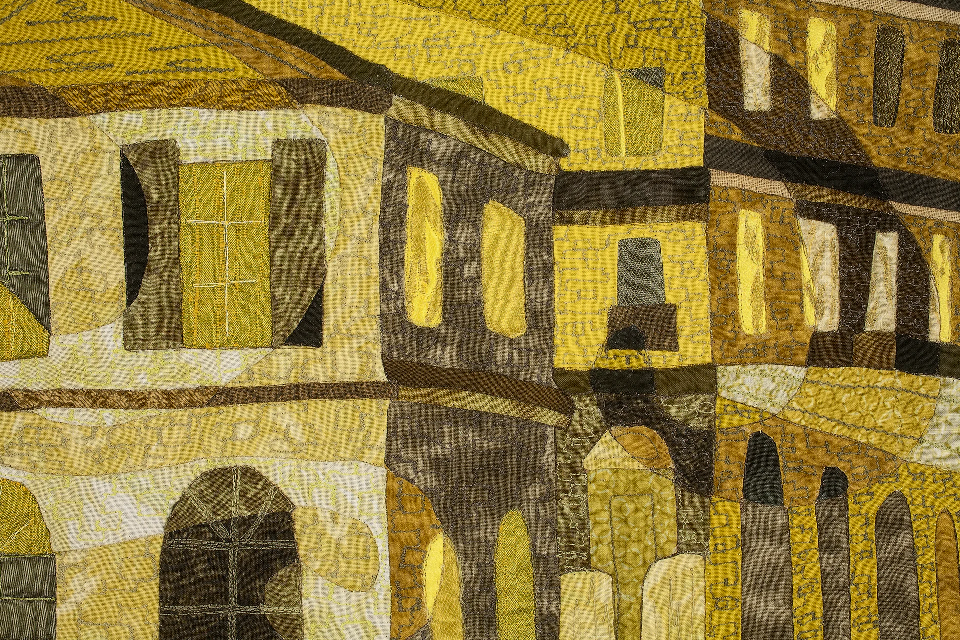 Techniques/Textiles: Turned under machine appliquéd, machine quilted/Cotton, silk and mixed fibre, wool batting. Hand mounted to acid free black foam core, framed.